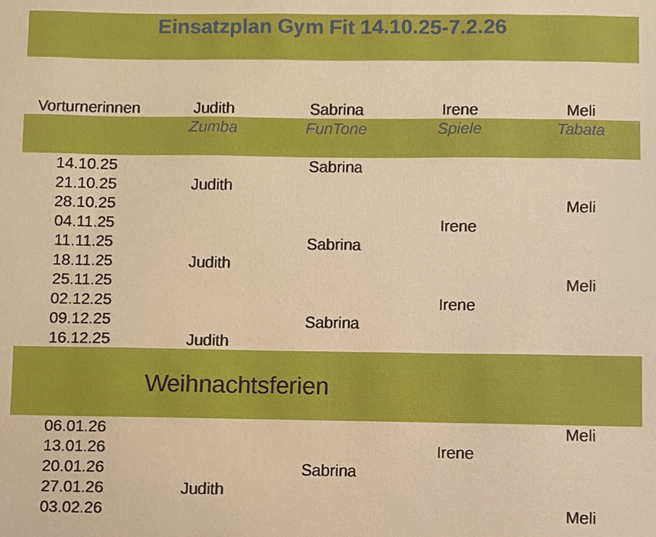 Wir bieten: Zumba vorgetanzt von Judith, FunTone geleitet von Sabrina und Krafttraining mit Ursi. Spielstunden angeleitet von Irene und Tabata mit Meli.